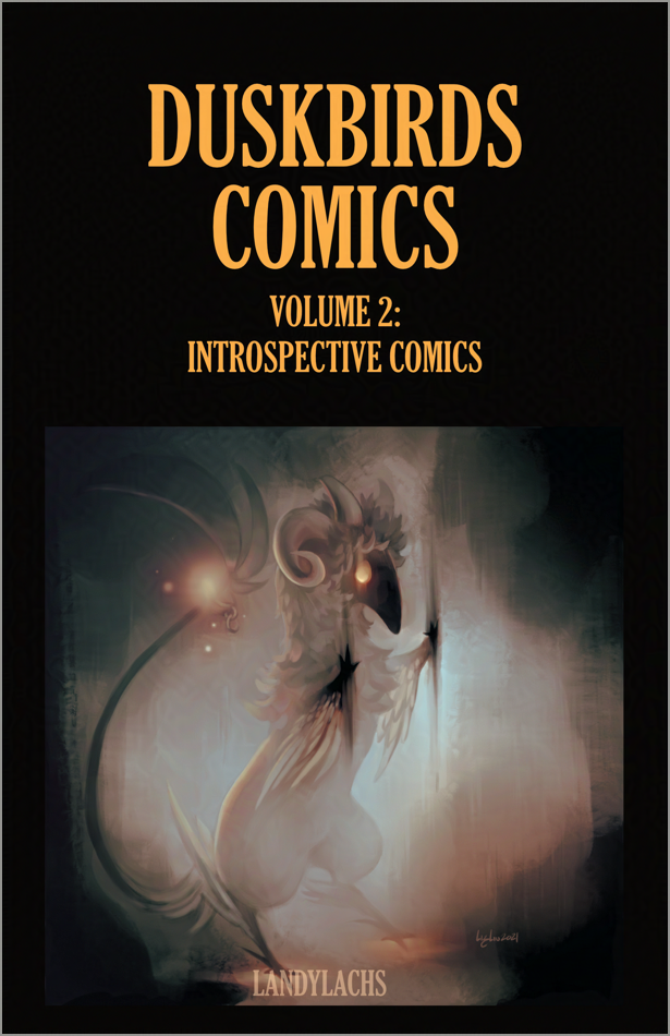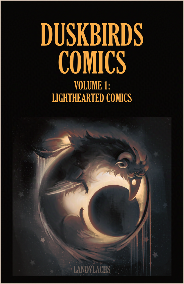 To celebrate, I retouched several of the older comics specially for this print edition, incorporating what I learned over the past year drawing The Harbinger’s Path comic. These touched-up Duskbirds Comics are currently only available in print. I’d like to eventually update these pages to the website here, but I don’t have a set schedule for when I can make time for this. So if you can, please stop by if you’d like to see the updated versions of these comics! :D More info further down in this post.